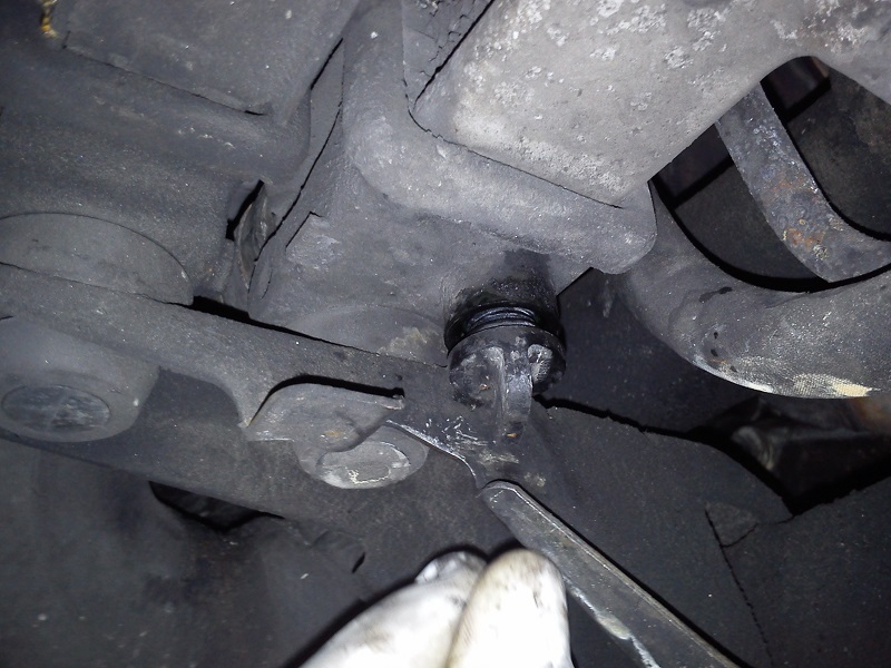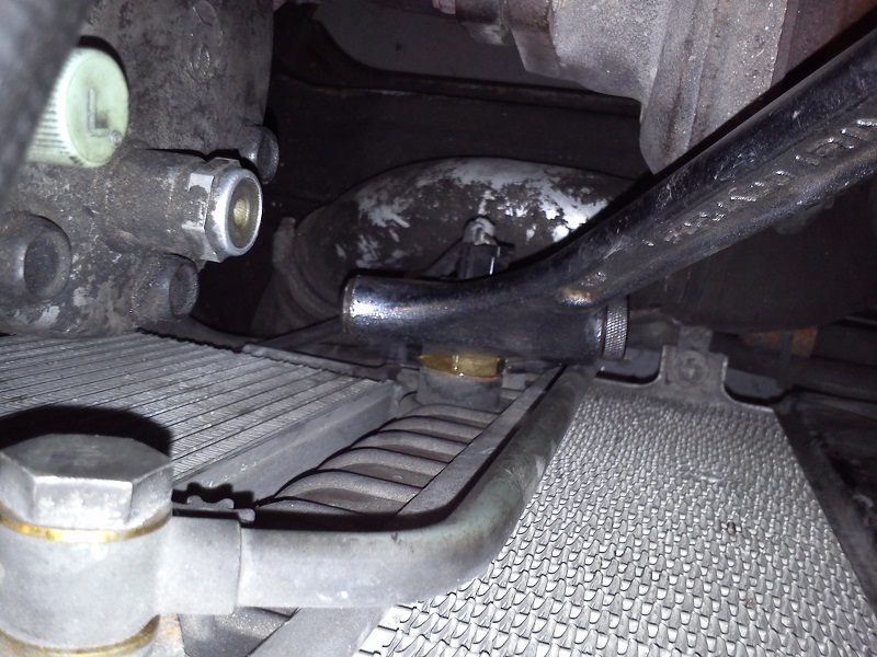 Tras esto, aparece el tapón de drenado del radiador (y, por ende, del circuito de refrigerante). Con un bol debajo, hay que desenrroscarlo: